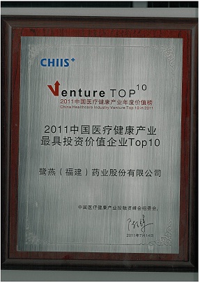 2011年7月14日,在北京舉辦的2011第五屆中國醫(yī)療健康產(chǎn)業(yè)投融資峰會上,鷺燕(福建)藥業(yè)股份有限公司榮獲“2011中國醫(yī)療健康產(chǎn)業(yè)最具投資價值企業(yè)TOP10”稱號。公司于2010年引進(jìn)建銀國際醫(yī)療產(chǎn)業(yè)基金等投資者近1.5億元投資后,在公司治理、經(jīng)營業(yè)績、戰(zhàn)略布局等方面得到進(jìn)一步提升,鞏固了公司在福建省醫(yī)藥流通領(lǐng)域的龍頭地位。