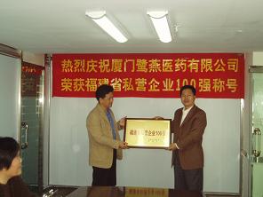 由福建省私營企業(yè)協(xié)會(huì)、福建日報(bào)社聯(lián)合開展的2005年度“福建省私營企業(yè)100強(qiáng)”評(píng)定活動(dòng),于近日揭曉最終入圍企業(yè),廈門鷺燕醫(yī)藥有限公司榜上有名。今天,市工商局的領(lǐng)導(dǎo)來我司進(jìn)行了授牌儀式。儀式上,吳金祥總裁向領(lǐng)導(dǎo)們介紹了鷺燕的成長歷程,并對將來的經(jīng)營進(jìn)行了展望。領(lǐng)導(dǎo)們在聽取了吳總裁的匯報(bào)后,肯定了鷺燕的發(fā)展模式,同時(shí),也對鷺燕的可持續(xù)發(fā)展提出了許多有益的建議。